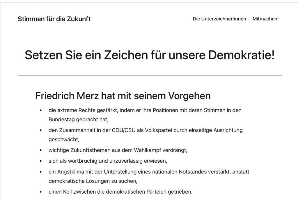 Mein Freund Norbert Bowe wird den folgenden Aufruf in der FAZ vom 21.2.2025 veröffentlichen. Mit diesem will er die Menschen, die die Position von Angela Merkel in der Migrationspolitik und in Bezug auf die Brandmauer gegenüber der AfD vertreten, erreichen. Sie sollten in der Wahl nicht die CDU oder CSU wählen, denn dadurch können Sie den sicheren Wahlsieg von Friedrich Merz schmälern.