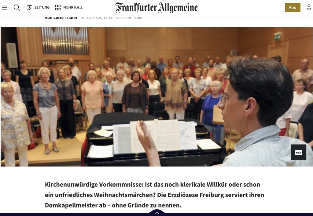 Es ist unfassbar, wie hier mit einem Kapellmeister umgegangen wird. Meiner Meinung nach muss nicht der ausgetauscht werden, sondern der Erzbischof! Freiburg kann sich glücklich schätzen, einen solchen Mann zu haben! Spricht nicht für den Freiburger Klerus, wie hier mit ihm umgegangen wird!