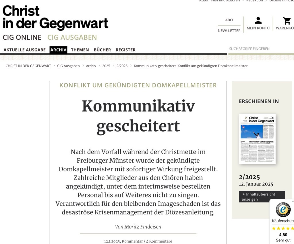 Leserbrief zum Artikel „Enttäuschung bricht sich Bahn“, Ausgabe vom 25. Januar 2025, Sigrun Rehm, S. 4 und „Im Fall des gekündigten Freiburger Domkapellmeisters werden Mobbingvorwürfe laut“, online am Mittwoch, 22. Januar 2025 (18:50), Joachim Röderer und Sigrun Rehm.