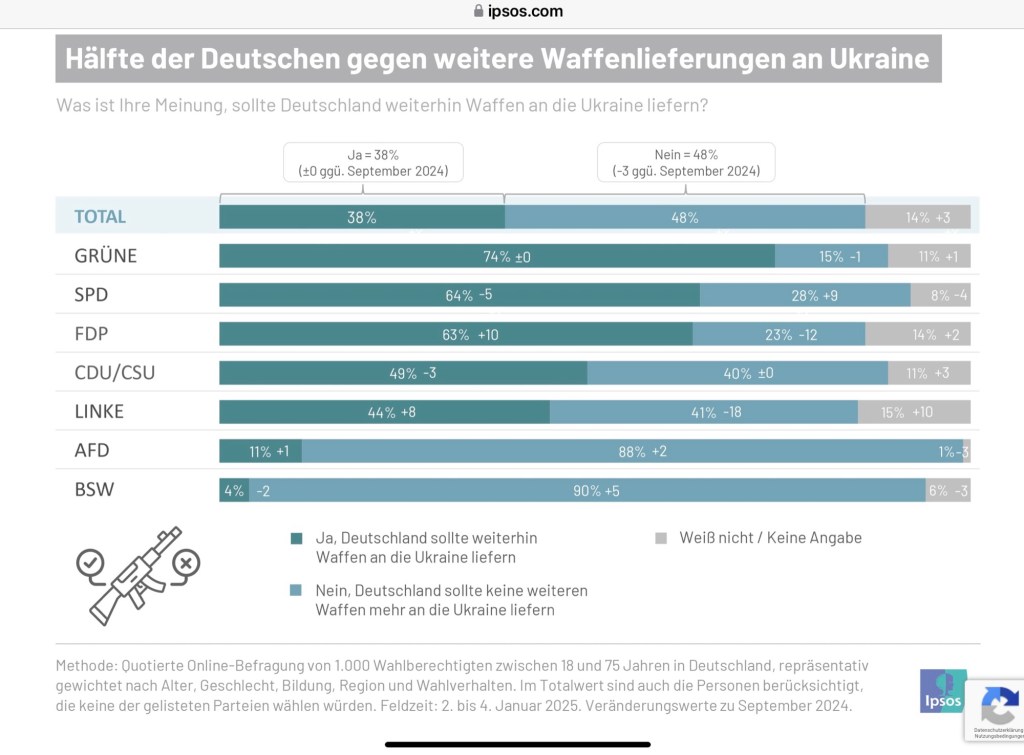 BSW- und AfD- Wähler sind zu 90 bzw. 88% gegen Waffenlieferungen.