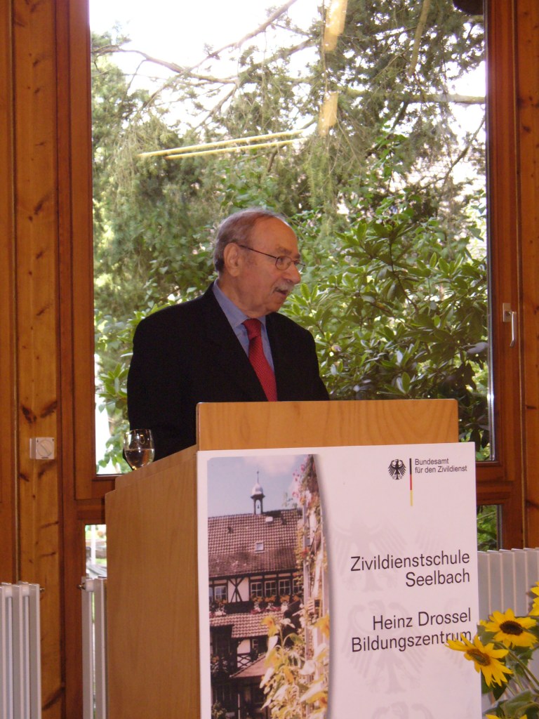 Bei diesem Podiumsgespräch nahmen neben Heinz Drossel Alexander Bergmann (Holocaustüberlebender aus Riga) und Prof. Arno Lustiger (Überlebender von Auschwitz und ein wichtiger Historiker, er prägte den Begriff „Rettungswiderstand“) teil. Heinz Drossel redet von seinem Schweigen in der Nachkriegszeit, er verweist auf seine und die schrecklichen Erfahrungen der anderen Gesprächsteilnehmer, dann geht er auf seine Familie und wichtige Erlebnisse aus der NS-Zeit ein.